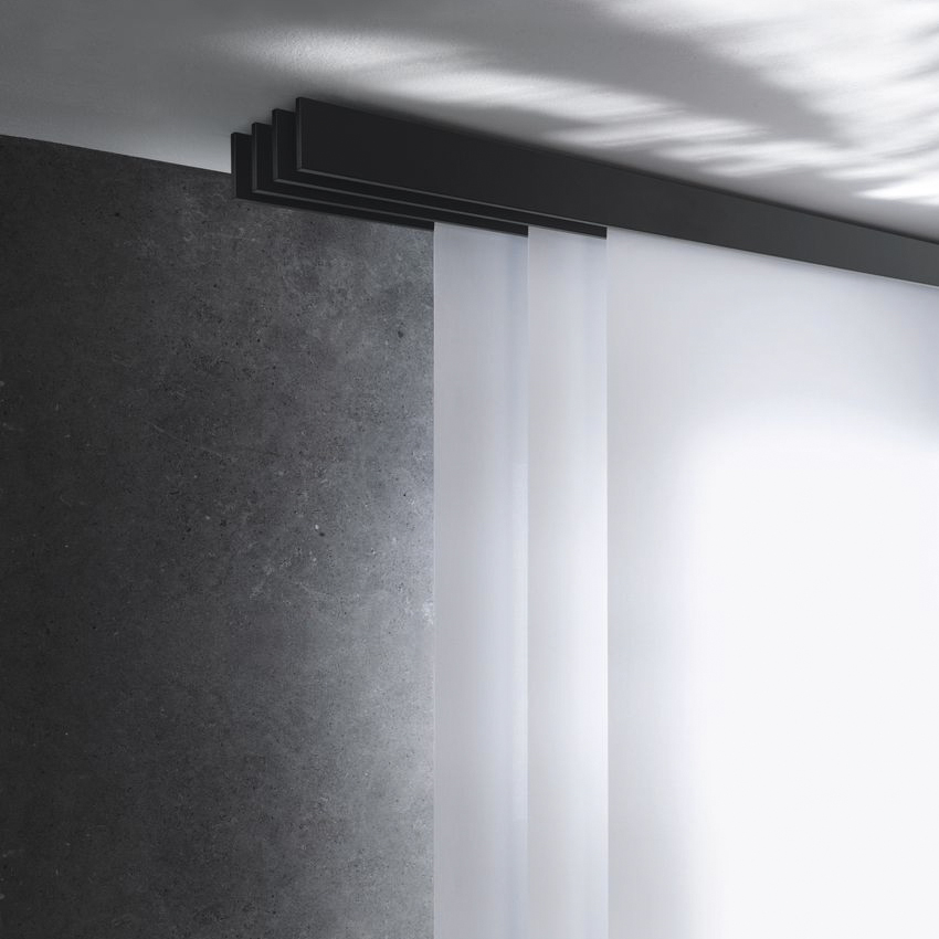 Das F1 Flächenvorhangsystem von Interstil ist ein hoch innovatives Schienensystem, das sowohl für Flächenvorhänge als auch Dekovorhänge ausgelegt ist. Die Besonderheit dieses Systems liegt in den absenktbaren Laufbahn. Durch diesen scheint die Fläche in der Schiene zu schweben. Durch den Einsatz einzelner Läufe ist dieses System zudem jederzeit zu ergänzen oder zu reduzieren.